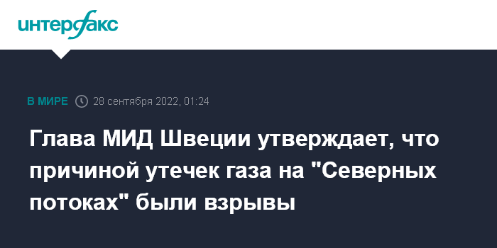 Москва. 28 сентября. INTERFAX.RU - Утечки газа на газопроводах "Северный поток" и "Северный поток 2" произошли в результате взрывов, заявила министр иностранных дел Швеции Анн Линде.