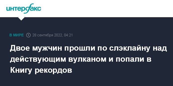 Москва. 28 сентября. INTERFAX.RU - Книга рекордов Гиннесса опубликовала видео, на котором двое молодых людей побили рекорд по самой длинной прогулке по слэклайну над действующим вулканом.