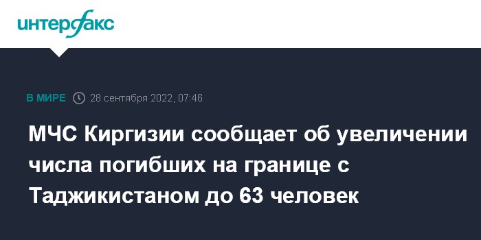 Москва. 28 сентября. INTERFAX.RU - Количество погибших в результате конфликта на киргизско-таджикской границе увеличилось до 63 человек, сообщает в среду МЧС Киргизии.