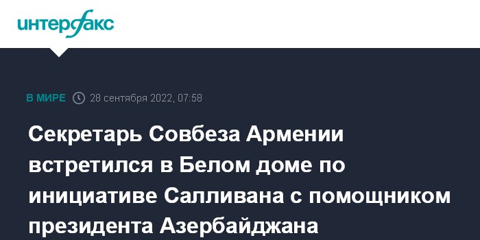 Москва. 28 сентября. INTERFAX.RU - Встреча секретаря Совета безопасности Армении Армена Григоряна и помощника президента Азербайджана Хикмета Гаджиева состоялась в Белом доме по инициативе советника президента США по вопросам нацбезопасности Джейка Салливана, сообщает СБ Армении.
