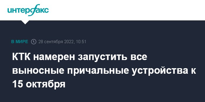 Москва. 28 сентября. INTERFAX.RU - Каспийский трубопроводный консорциум (КТК) намерен к 15 октября запустить все поврежденные ранее выносные причальные устройства (ВПУ), сообщил журналистам глава Минэнерго Казахстана Болат Акчулаков.