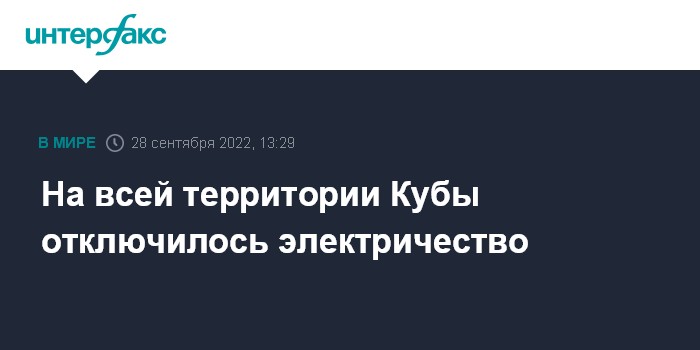 Москва. 28 сентября. INTERFAX.RU - Полное отключение электроснабжения произошло в ночь на среду по местному времени на всей территории Кубы, сообщает Объединение электросистем страны.