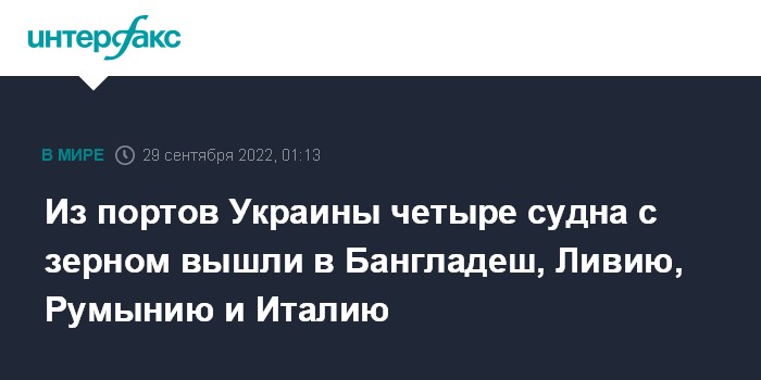 Москва. 29 сентября. INTERFAX.RU - Украинские порты в среду покинули четыре сухогруза с почти 115 тыс. тонн продовольствия, получив разрешение на это от совместного координационного центра (СКЦ), сообщает ООН.