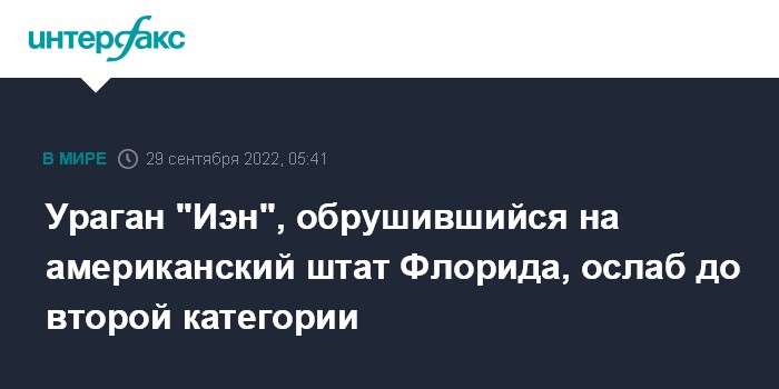Москва. 29 сентября. INTERFAX.RU - Ураган "Иэн", который обрушился на американский штат Флорида, ослаб до второй категории, сообщают экстренные службы США.