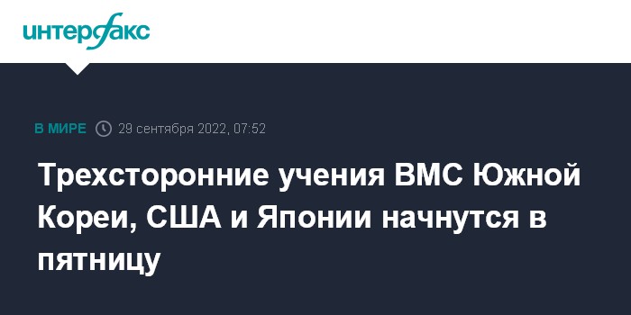 Москва. 29 сентября. INTERFAX.RU - В пятницу Южная Корея, США и Япония приступят к проведению трехсторонних совместных военно-морских противолодочных учений в международных водах Японского моря, сообщило южнокорейское агентство Yonhap со ссылкой на официальные источники.