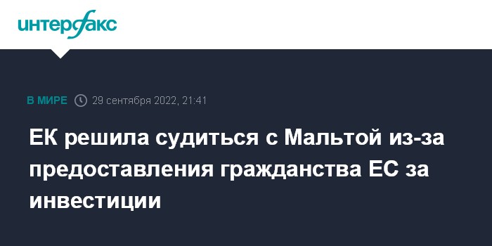 Москва. 29 сентября. INTERFAX.RU - Европейская комиссия (ЕК) решила подать в суд Евросоюза на Мальту из-за продолжающейся программы "золотой паспорт" этой страны-участницы ЕС, передает АР. По этой программе состоятельные иностранцы могут приобретать гражданство ЕС в обмен на крупные инвестиции.