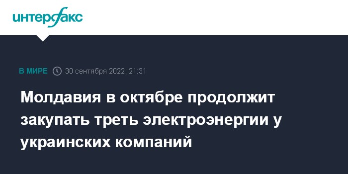 "Государственная компания Energocom заключила следующие договоры на поставку электроэнергии: на 67% с Молдавской ГРЭС (Приднестровье, принадлежит российской "Интер РАО" - ИФ) по цене $62,5 за 1 МВт.ч на октябрь месяц; на 30% закупки заключен договор с компанией "Энергоатом" по цене $77/МВт.ч на период 1-15 октября; на 3% заключен договор с "Укргидроэнерго" по цене $132/МВт.ч на период 1-15 октября", - написал Спыну в Telegram.