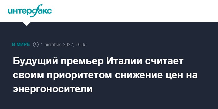 Москва. 1 октября. INTERFAX.RU - Работа над решением проблемы высоких цен на энергоносители станет приоритетом следующего правительства Италии, заявила победившая на недавних парламентских выборах лидер партии "Братья Италии" Джорджа Мелони.