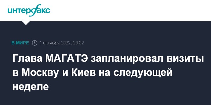Москва. 1 октября. INTERFAX.RU - Гендиректор МАГАТЭ Рафаэль Гросси может посетить Москву и Киев на следующей неделе в рамках усилий по установлению зоны безопасности вокруг Запорожской АЭС, сообщается в субботу на сайте агентства.