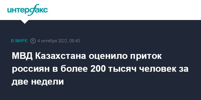 На 27 сентября сообщалось, что, по данным комитета миграционной службы МВД Казахстана, в страну с 21 сентября въехало около 98 тысяч россиян, выехали - 64 234, индивидуальный идентификационный номер за тот период получили чуть более 8 тысяч нерезидентов.