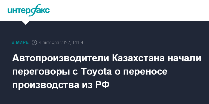 "Toyota - один из самых популярных брендов в нашей стране. Если такая возможность будет... Понятно, что наши производители ведут переговоры, как бизнес с бизнесом", - сказал Ускенбаев на брифинге во вторник, отвечая на вопрос о возможном переносе завода Toyota в Казахстан после его закрытия в РФ.