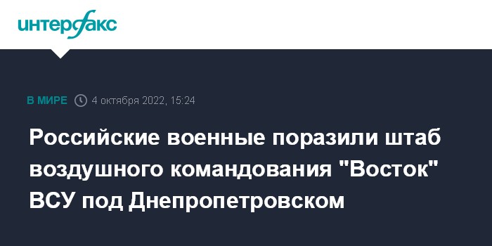 Москва. 4 октября. INTERFAX.RU - В Минобороны РФ заявили, что на юго-западной окраине Днепропетровска высокоточным авиаударом поражен штаб воздушного командования "Восток" Вооруженных сил Украины.