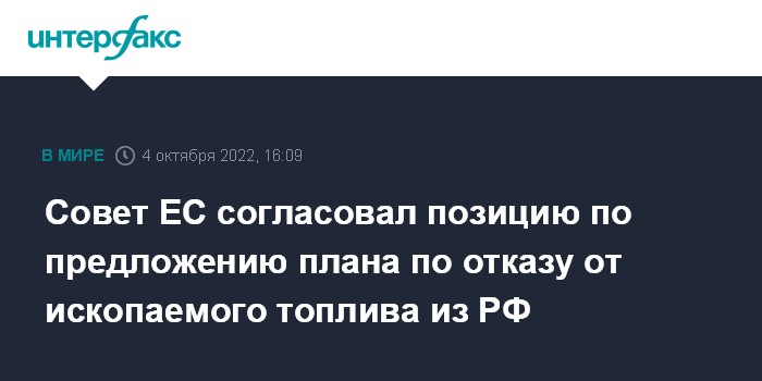 Москва. 4 октября. INTERFAX.RU - Совет ЕС объявил во вторник, что согласовал единый подход стран Евросоюза по предложению плана поэтапного отказа от зависимости сообщества от российского импорта ископаемого топлива - REPowerEU.