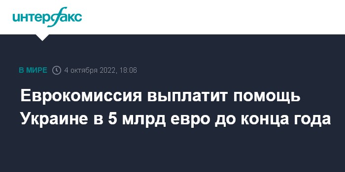 Москва. 4 октября. INTERFAX.RU - В Европейской комиссии (ЕК) обещают выплатить Украине транш макрофинансовой помощи в 5 млрд евро как можно быстрее, сообщил исполнительный заместитель председателя ЕК Валдис Домбровскис.