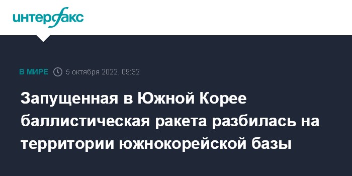 Москва. 5 октября. INTERFAX.RU - Баллистическая ракета Hyumoo-2, которую южнокорейские военные попытались запустить на ракетных учениях, потерпела аварию на территории базы ВВС Южной Кореи в районе города Каннын на востоке страны, сообщает Associated Press (AP).
