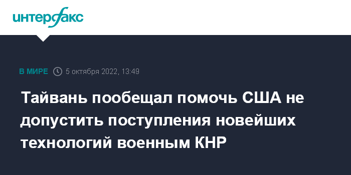 Москва. 5 октября. INTERFAX.RU - Власти Тайваня заверили, что намерены вместе с США и другими союзниками не позволить новейшим технологиям, в том числе в сфере полупроводников, оказаться в распоряжении китайскийх военных, сообщает Bloomberg.