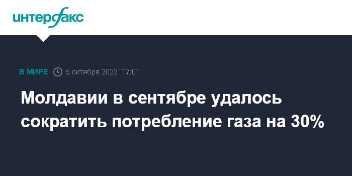 Москва. 5 октября. INTERFAX.RU - Жители Молдавии прислушались к призыву правительства экономить энергоресурсы, и в результате страна в сентябре сократила потребление газа на 30% по сравнению с аналогичным периодом 2021 года, сообщил вице-премьер Молдавии, министр экономики и регионального развития Андрей Спыну.