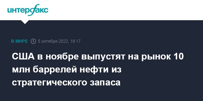 США в ноябре выпустят на рынок 10 млн баррелей нефти из стратегического запаса