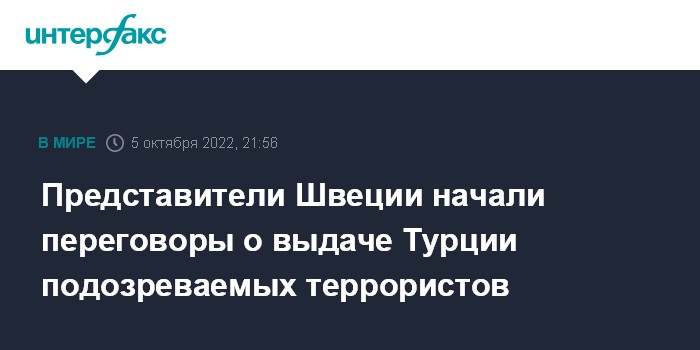 15 сентября Минюст Турции раскритиковал Швецию и Финляндию за промедление с вопросами о выдаче Анкаре подозреваемых в терроризме. 1 октября президент Реджеп Тайип Эрдоган пообещал, что Турция не ратифицирует вступление в НАТО Швеции и Финляндии до тех пор, пока эти страны не выполнят данные Анкаре обещания.