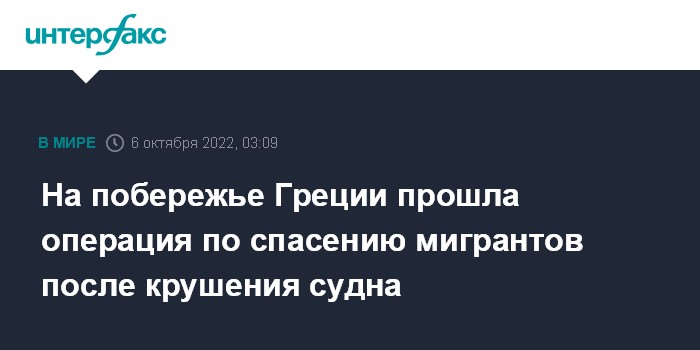 Москва. 6 октября. INTERFAX.RU - Крупномасштабная спасательная операция проводилась у греческого острова Китира, где парусное судно со 100 мигрантами на борту налетело на скалы и затонуло из-за сильного ветра в среду вечером, сообщило агентство Associated Press (АР) со ссылкой на местные власти.