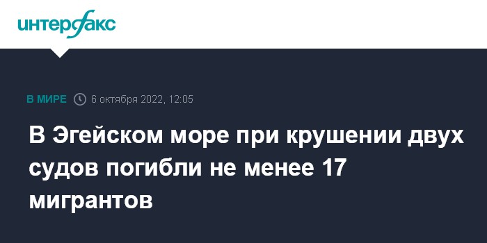 Москва. 6 октября. INTERFAX.RU - В Эгейском море у островов Лесбос и Китира затонули суда с нелегальными мигрантами из Африки, погибли не менее 17 человек, сообщает издание Кathimerini. Еще несколько человек спасены и уже доставлены в больницы. Продолжаются поиски еще 13 человек.