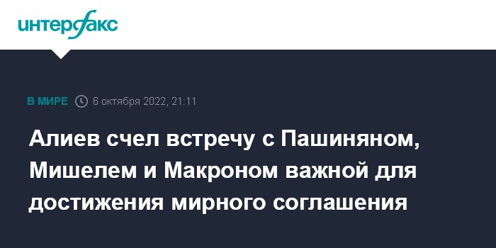 Москва. 6 октября. INTERFAX.RU - Президент Азербайджана Ильхам Алиев в четверг заявил, что четырехсторонняя встреча с участием премьер-министра Армении Никола Пашиняна, президента Франции Эммануэля Макрона и главы Евросовета Шарля Мишеля, прошедшая в Праге, придала положительный импульс мирному процессу между Баку и Ереваном.