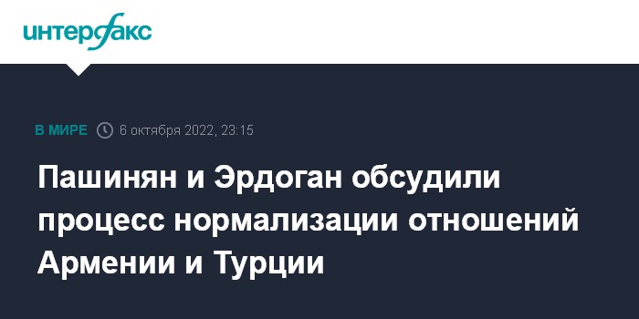 Москва. 6 октября. INTERFAX.RU - Премьер-министр Армении Никол Пашинян и президент Турции Реджеп Тайип Эрдоган обсудили в ходе встречи процесс нормализации армяно-турецких отношений и возможные дальнейшие шаги в этом направлении, сообщает пресс-служба армянского правительства в четверг.