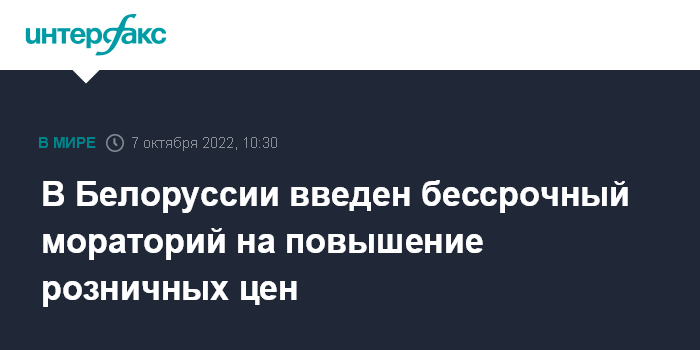 Москва. 7 октября. INTERFAX.RU - Правительство Белоруссии 6 октября ввело бессрочный мораторий на повышение цен для компаний всех форм собственности. В постановлении о моратории говорится, что он будет действовать "до особого решения Совета министров".