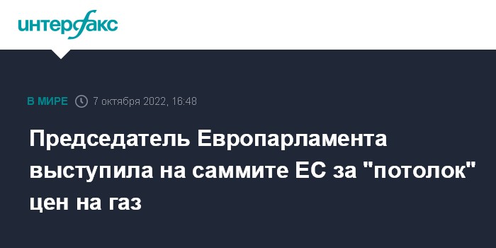 Председатель Европарламента выступила на саммите ЕС за "потолок" цен на газ