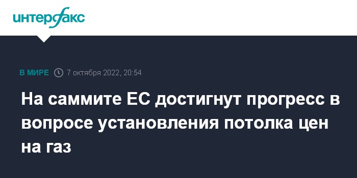 Москва. 7 октября. INTERFAX.RU - На состоявшемся в пятницу неформальном саммите ЕС в Праге был "достигнут прогресс в вопросе установления потолка цен на газ", заявила глава Еврокомиссии Урсула фон дер Ляйен.