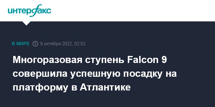 Москва. 9 октября. INTERFAX.RU - Многоразовая первая ступень американской ракеты-носителя Falcon 9, стартовавшей в воскресенье по московскому времени на орбиту с двумя телекоммуникационными спутниками Galaxy 33 и 34 американского оператора Intelsat, совершила успешную управляемую посадку на плавучую платформу в Атлантике, сообщила компания-разработчик SpaceX.
