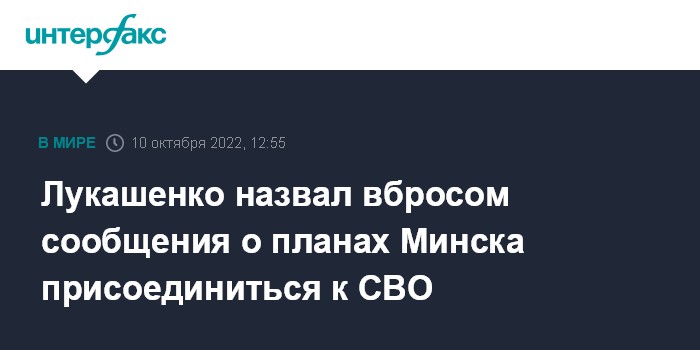 Москва. 10 октября. INTERFAX.RU - Президент Белоруссии Александр Лукашенко заявил, что информация о намерении белорусской армии присоединиться к российской спецоперации на Украине является вбросом, передает "БелТА".