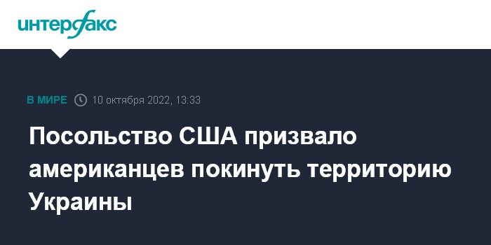 Москва. 10 октября. INTERFAX.RU - Посольство США в Киеве обратилось с призывом к американским гражданам выехать за пределы территории Украины, сообщили в понедельник украинские СМИ со ссылкой на информацию дипмиссии в соцсетях.