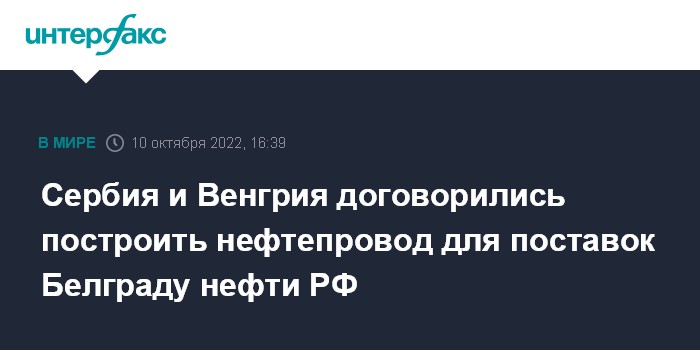 Москва. 10 октября. INTERFAX.RU - Власти Сербии и Венгрии пришли к соглашению по поводу строительства нефтепровода между обеими странами, по которому Белград сможет получать поставляемую Россией до Венгрии нефть, сообщает в понедельник агентство EFE.
