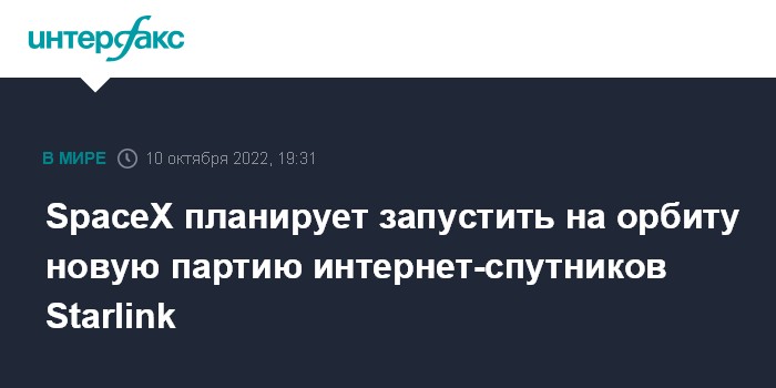 Москва. 10 октября. INTERFAX.RU - Американская компания SpaceX готовится запустить на орбиту в октябре очередную группу из нескольких десятков мини-спутников для пополнения орбитальной группировки глобальной сети интернет-покрытия системы Starlink, сообщает специализированный сайт Spaceflight Now.