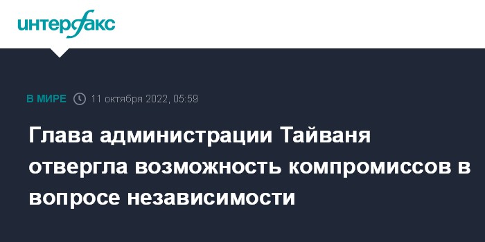 Москва. 11 октября. INTERFAX.RU - Тайвань не пойдет на компромиссы в вопросе своей независимости и суверенитета, заявила глава администрации острова Цай Инвэнь.