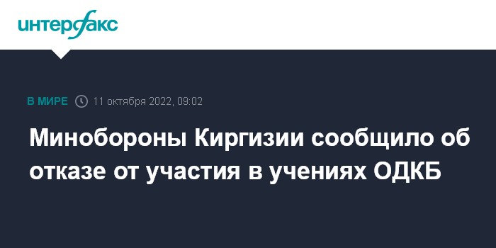 10 октября в Минобооны Киргизии заявили, что киргизская сторона отменила проведение командно-штабных учений миротворческих сил ОДКБ "Нерушимое братство-2022", запланированных на 10-14 октября на территории республики. Причины отмены учений также не сообщались.