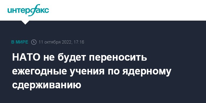Москва. 11 октября. INTERFAX.RU - В НАТО не планируют переносить намеченные на октябрь учения по ядерному сдерживанию, так как это подало бы неверный сигнал, заявил во вторник генсек альянса Йенс Столтенберг.