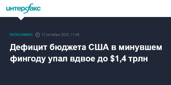 Москва. 12 октября. INTERFAX.RU - Дефицит федерального бюджета США в минувшем финансовом году, который завершился 30 сентября, сократился вдвое и составил около $1,4 трлн против $2,8 трлн годом ранее, пишет The Wall Street Journal со ссылкой на предварительную оценку Бюджетного управление Конгресса (CBO).
