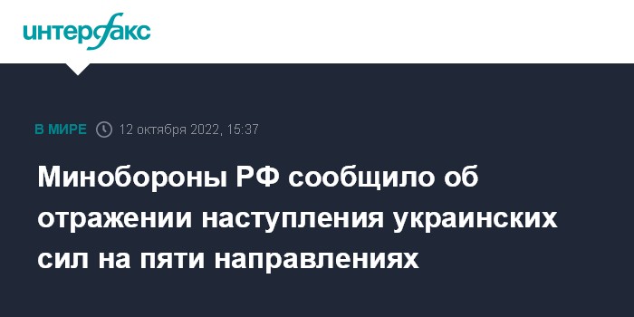 Москва. 12 октября. INTERFAX.RU - Российские военные отразили попытки наступления вооружённых силу Украины (ВСУ) на Купянском, Краснолиманском, Запорожском, Криворожском и Андреевском направлениях, сообщил официальный представитель Минобороны России Игорь Конашенков.