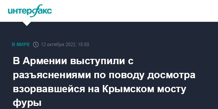 Москва. 12 октября. INTERFAX.RU - Комитет государственных доходов Армении выступил с разъяснениями по поводу досмотра на территории республики фуры, которая 8 октября взорвалась на Крымском мосту - большегруз прошел все досмотры, предусмотренные процедурами ЕАЭС: факторы риска не были обнаружены.