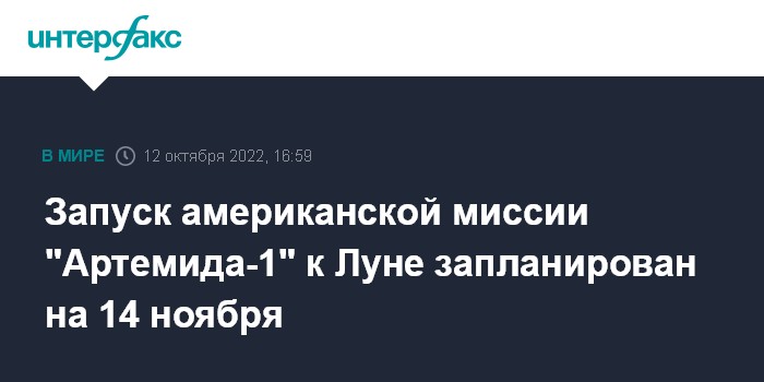 Москва. 12 октября. INTERFAX.RU - Запуск сверхтяжелой ракеты-носителя Space Launch System (SLS) к Луне с космическим кораблем Orion в рамках миссии Artemis 1 ("Артемида-1") запланирован на 14 ноября, сообщило в среду Национальное управление США по аэронавтике и исследованию космического пространства (NASA).