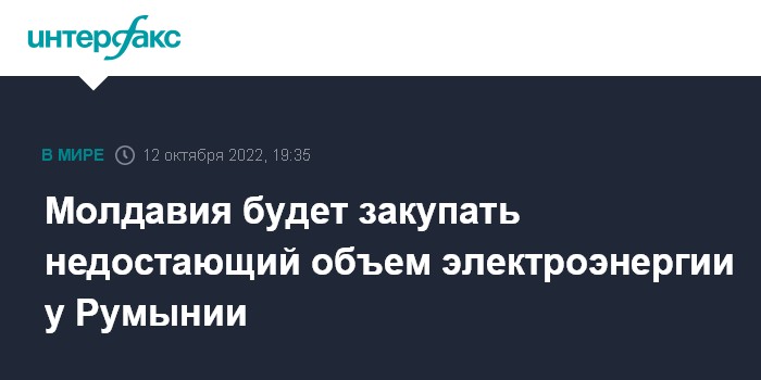 Москва. 12 октября. INTERFAX.RU - Молдавия после прекращения подачи электроэнергии с Украины будет закупать недостающий объем в Румынии. Об этом сообщил вице-премьер, министр инфраструктуры и регионального развития Андрей Спыну в среду журналистам.