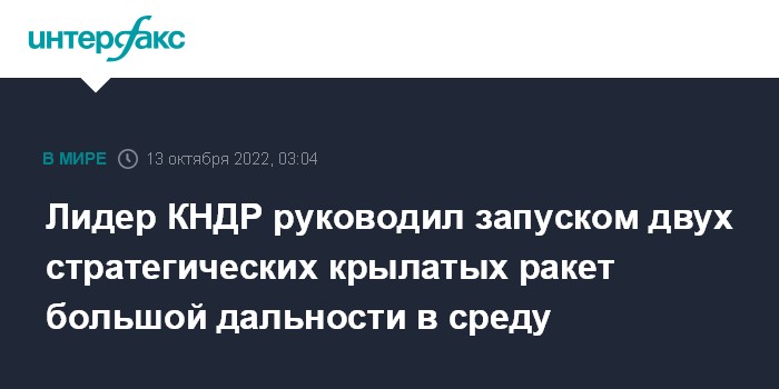Москва. 13 октября. INTERFAX.RU - Северокорейский лидер Ким Чен Ын на месте руководил испытательным запуском стратегических крылатых ракет большой дальности, успешно проведенным в среду, сообщает ЦТАК.