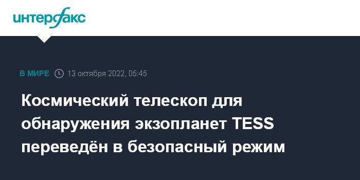 Москва. 13 октября. INTERFAX.RU - Космический телескоп Transiting Exoplanet Survey Satellite (TESS) перешёл в безопасный режим из-за неполадок с бортовым компьютером, сообщило в среду Национальное управление США по аэронавтике и исследованию космического пространства (NASA).