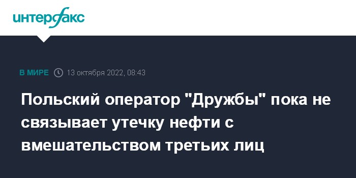 Москва. 13 октября. INTERFAX.RU - Польский трубопроводный оператор Pern, обнаруживший в среду утечку на нефтепроводе "Дружба", пока не выявил признаков вмешательства третьих лиц, информирует компания.