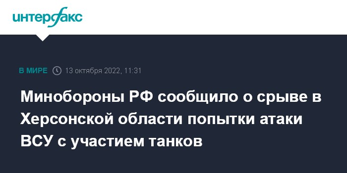 Москва. 13 октября. INTERFAX.RU - Украинские военные на бронетехнике попытались прорвать оборону российских войск в Херсонской области, атака была сорвана, заявили в Минобороны РФ.