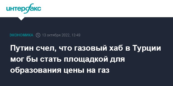 Москва. 13 октября. INTERFAX.RU - Газовый хаб в Турции в случае его создания мог бы стать площадкой для образования цены на газ, а также для поставок в европейские страны, заявил президент РФ Владимир Путин на встрече с президентом Турции Реджепом Тайипом Эрдоганом.