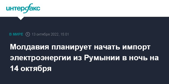 Москва. 13 октября. INTERFAX.RU - Молдавия с нуля часов 14 октября начнет получать недостающий объем электроэнергии из Румынии, сообщили "Интерфаксу" в пресс-службе молдавского правительства.