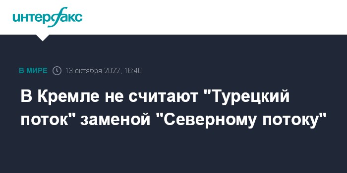 Москва. 13 октября. INTERFAX.RU - Газопровод "Турецкий поток" не заменит выведенный из строя "Северный поток", считает пресс-секретарь президента Дмитрий Песков. Он высказал это мнение телеканалу "Известия", отрывок выложен в телеграм-канале издания.